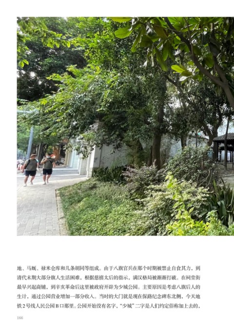 地、马厩、禄米仓库和几条胡同等组成。由于八旗官兵在那个时期被禁止自食其力,到 清代末期大部分旗人生活困难,根据慈禧太后的指示,满汉格局被渐渐打破。在祠堂街 最早兴起商铺,到辛亥革命后这里被政府开辟为少城公园。主要原因是考虑八旗后人的 生计,通过公园营业增加一部分收入。当时的大门就是现在保路纪念碑东北侧,今天地 铁2号线人民公园B口那里。公园开始没有名字,“少城”二字是人们约定俗称加上去的, 166 167